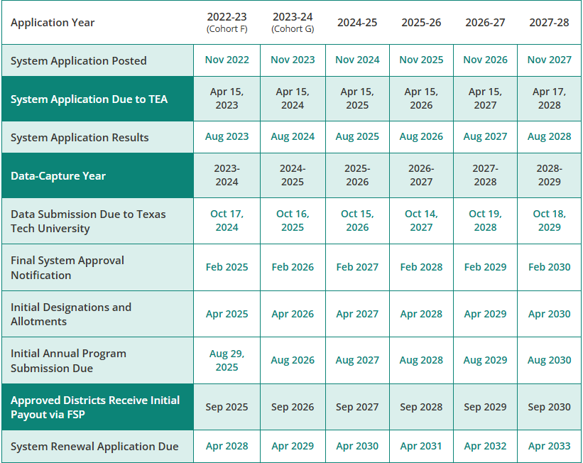 The work we are undertaking to secure TIA funding for the district is a multi-year process. TIA Texas established a rolling application process, whereby districts can apply in one of the cohorts. Center ISD, along with a majority of districts across the state, is applying in Cohort E.